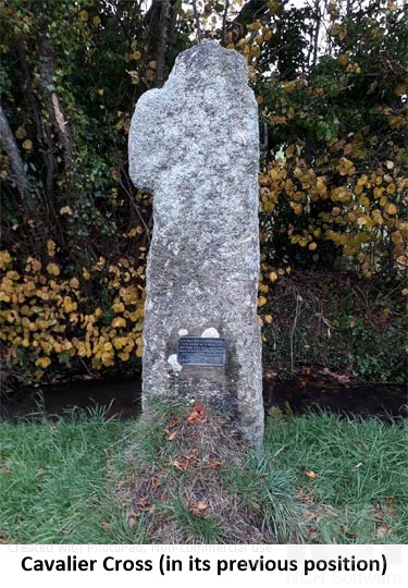 A382 Newton Abbot to Moretonhampstead road in Bovey Tracey.O/S Grid Ref: SX/80965/77826 Longitude/Latitude (Degrees+/-): -3.68290/50.58799 Map location: Click here to view map. Purpose: Memorial to an unknown Royalist Officer who fell near this spot during the English Civil War. Size: 5 feet 10 inches (1.78 metres) tall, 1 foot 6 inches (0.46 metres) across the shaft and surviving arm. Information: Cavalier's Cross, also known as Challabrook Cross, is another that has a battered history and has been used for some time as a gatepost. One arm is completely missing, the other has been shortened and the head is badly damaged. There are traces of an incised cross on each face, between the arms. The shaft of the cross now bears a brass plate, with the following inscription: